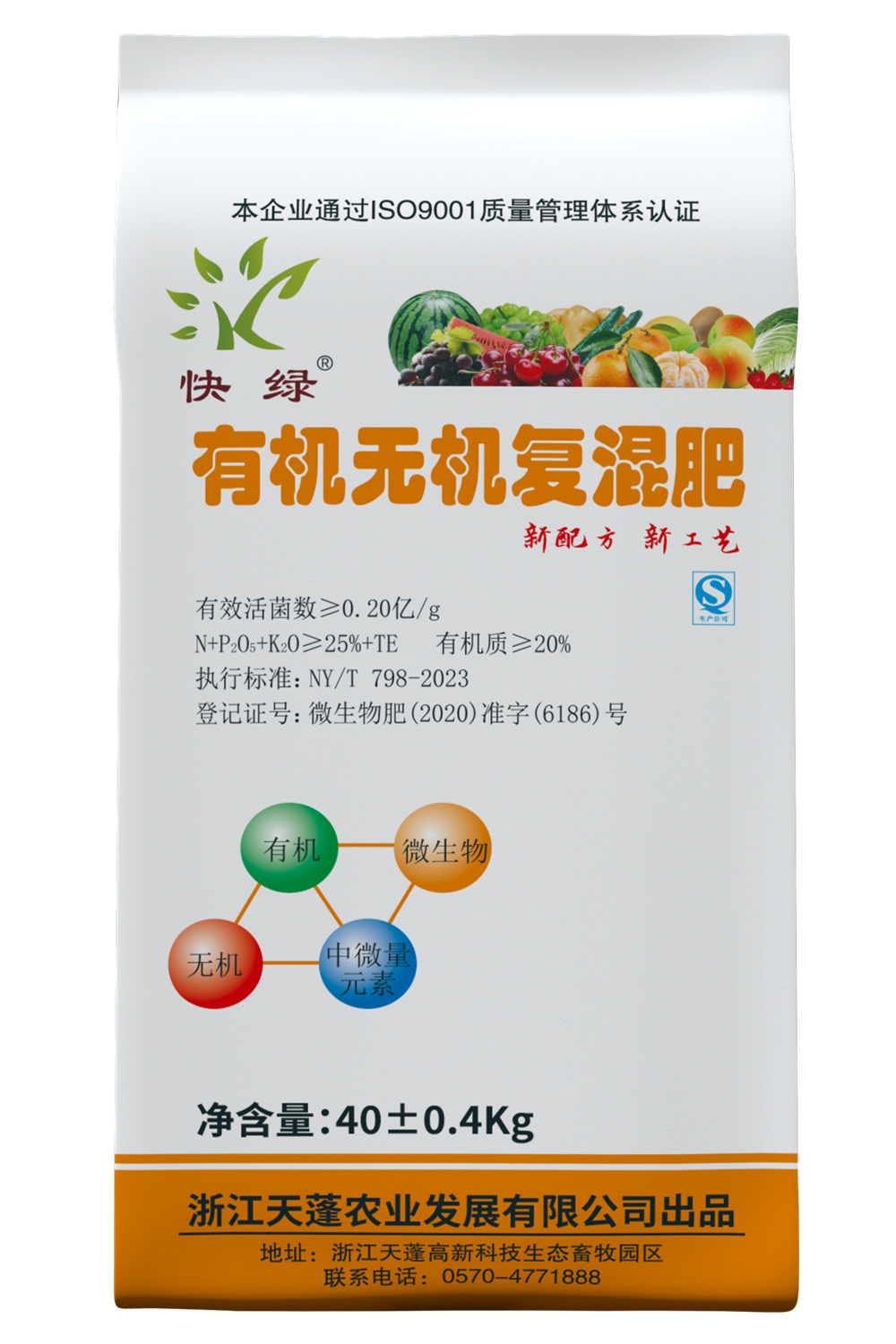 创建于 2002年,位于江山市贺村镇天蓬农业科技园区。现有国内领先的年产10万吨颗粒有机复混肥生产线,主要生产销售“快绿牌”有机肥、花卉专用肥、复合微生物菌肥、有机无机复混肥、水溶肥、叶面肥以及测土配方肥。公司始终坚持“让土地提质增效、让用户增产增收”的理念,生产推广测土配方肥料,从根本上解决土壤恶化、农产品品质下降、投入大、效益低的现象,助力生态农业高质量发展。